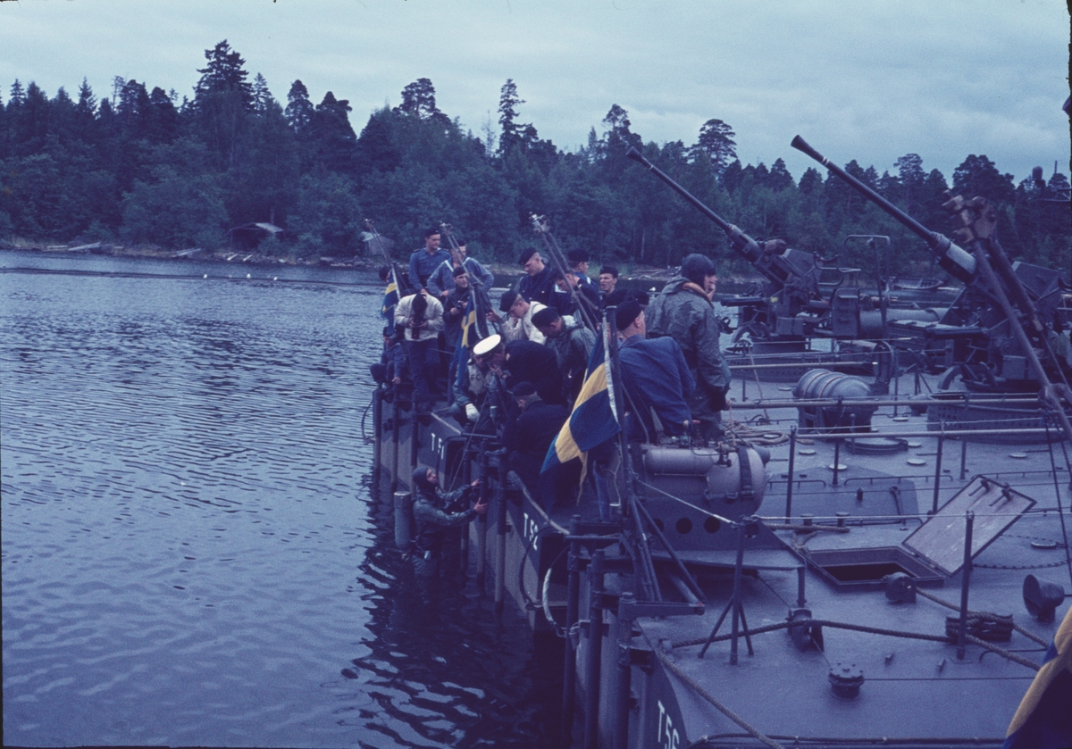 Bilden visar ren rad motortorpedbåtar som ligger förtöjt vid kajen. Mitt på bilden ser man hur en dykare kliver ombord på T 52.
