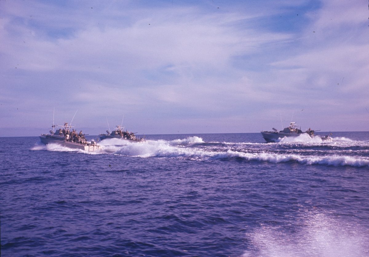 Bilden visar ett flertal motortorpedbåtar till sjöss som kör bredvid varandra i full fart.
