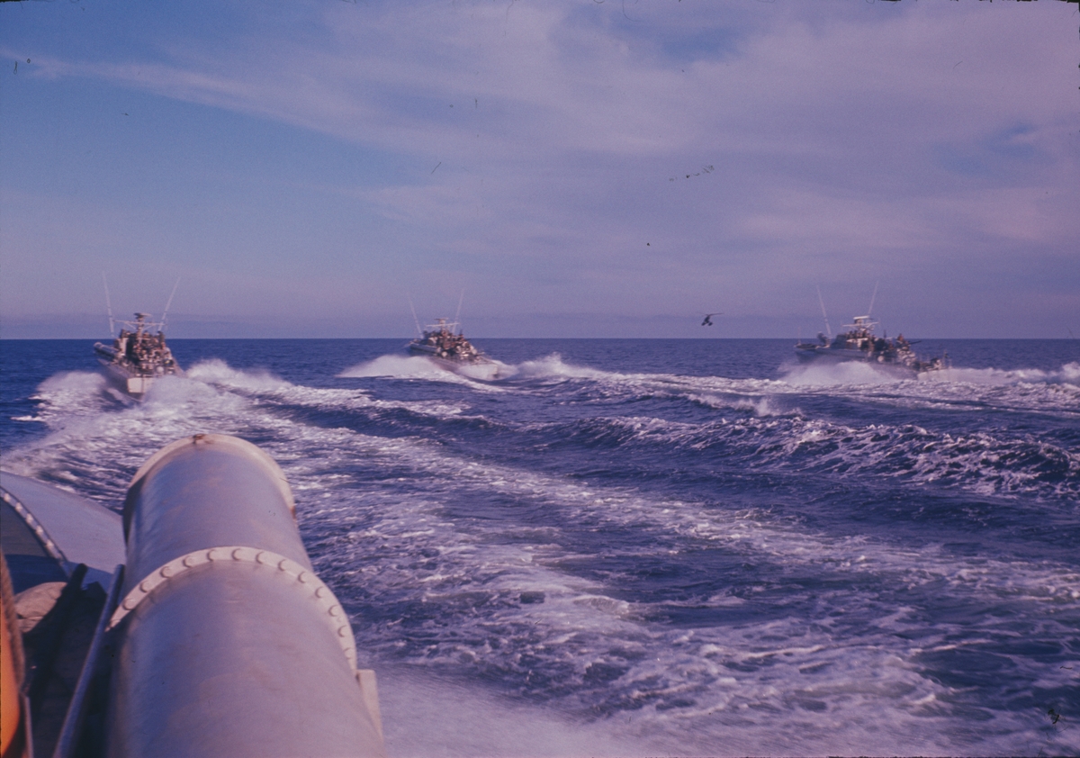 Bilden visar ett flertal motortorpedbåtar till sjöss som kör bredvid varandra i full fart.