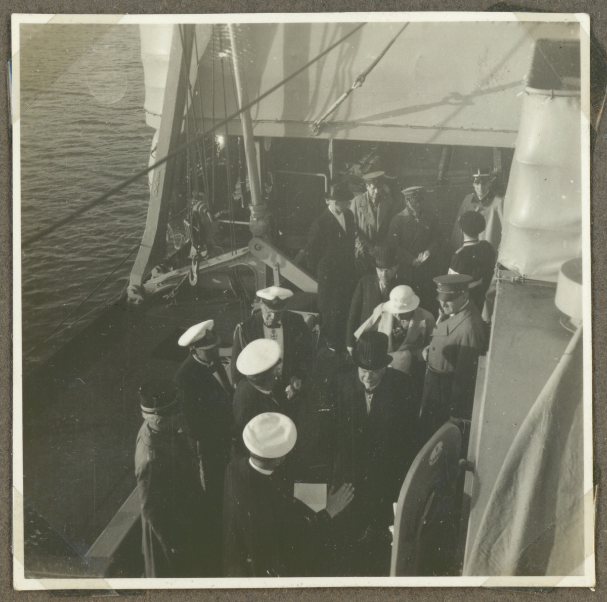 Bilden visar Sveriges kung Gustav V och Finlandspresident Pehr Evind Svinhufvud på besök ombord på flygplanskryssaren Gotland.