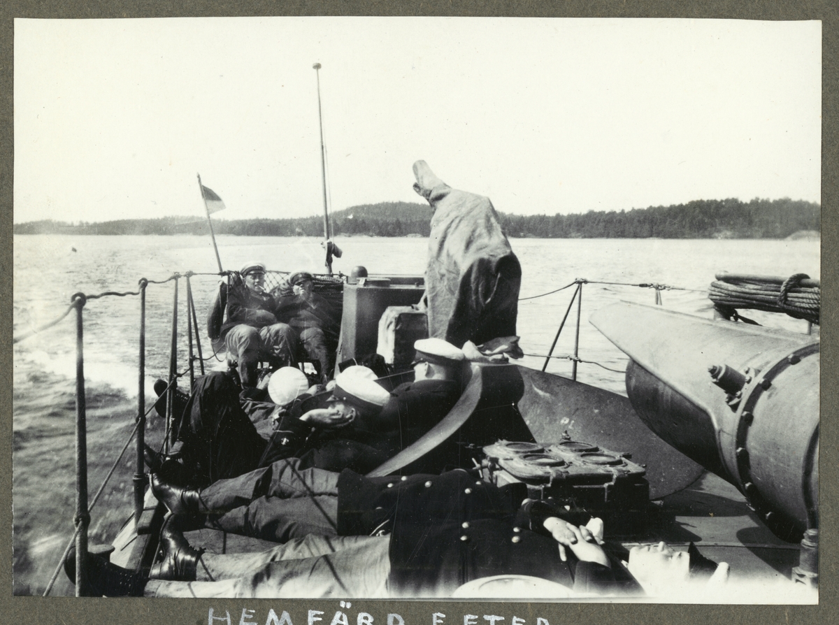 Bilden visar besättningen på en torpedbåt som vilar på akterdäcket under hemfärden.