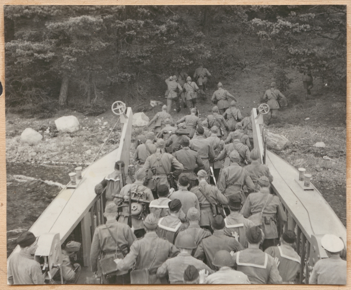 Soldater springer ut i skogen från en landstigningsbåt under en militär övning.