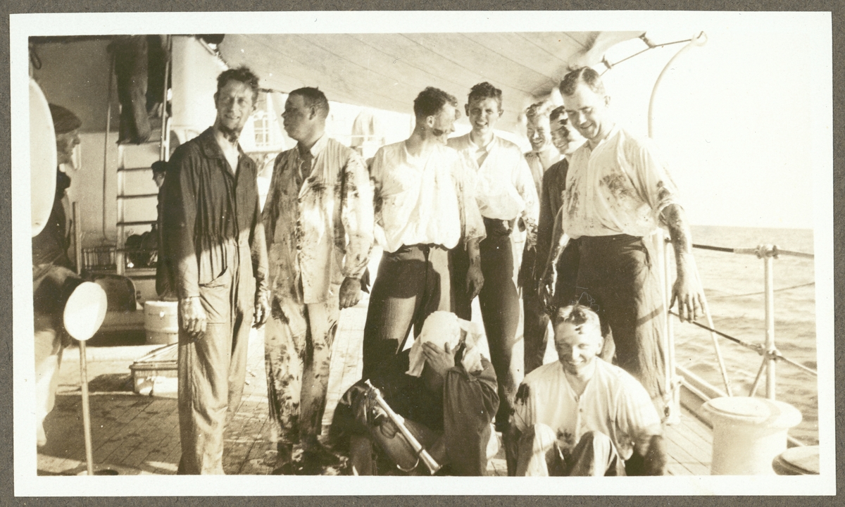 Bilden visar en grupp besättningsmedlemmar på Fylgia efter sotningen på linjen.
