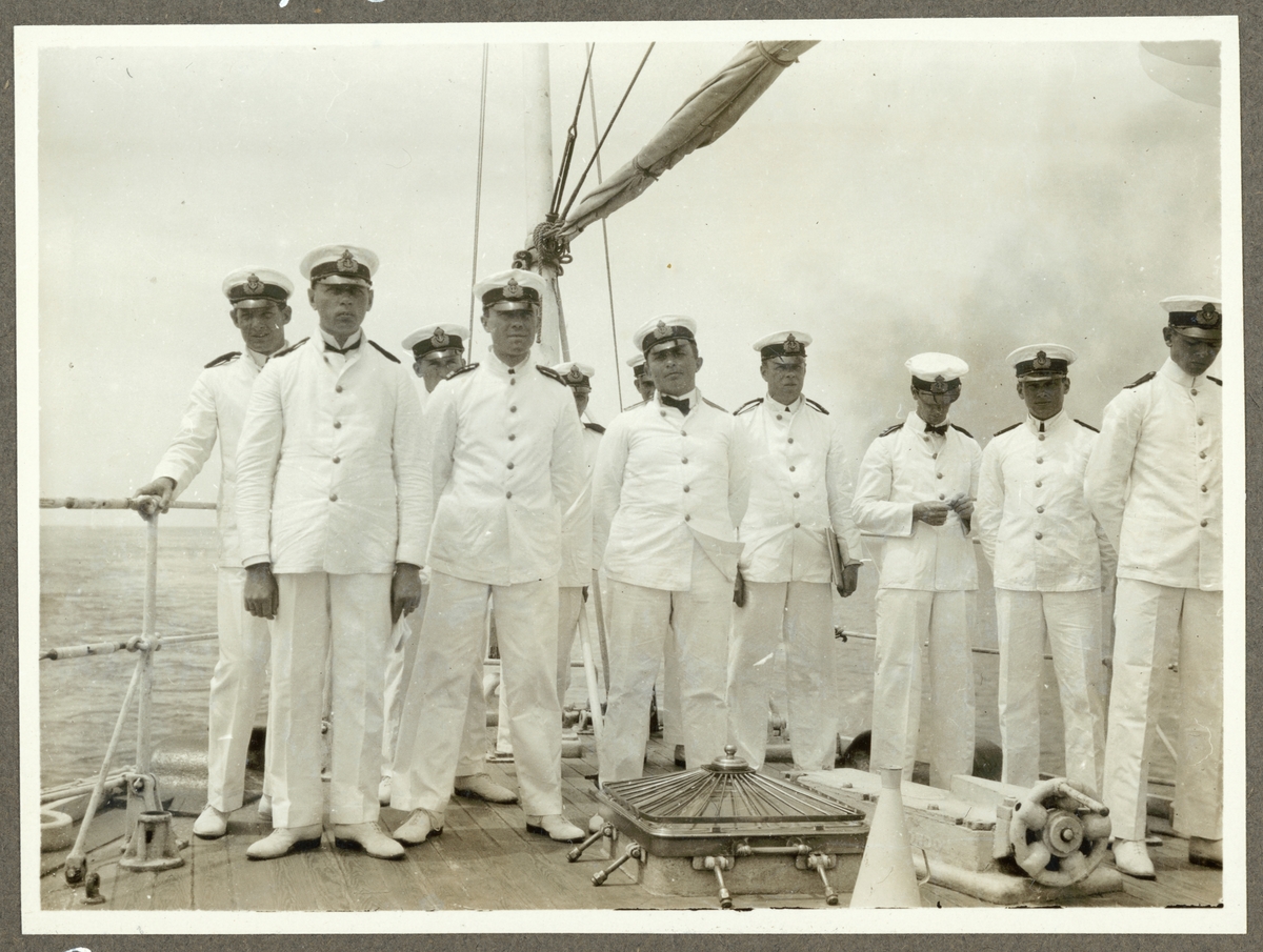 Bilden visar Fylgias samlade befäl som har tagit uppställning på akterdäcket för en gruppfoto.