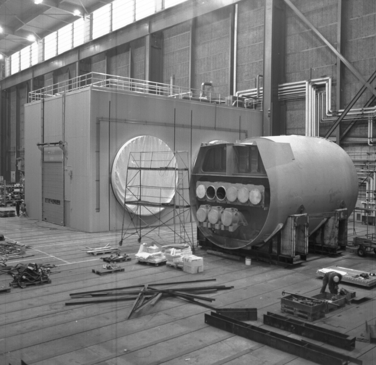 :: Ubåtssektion till ubåt typ Västergötland i skrovhallen\\\\anm neg ingår i en serie om 9 st varav endast det första\\V 98494 scannats/gp