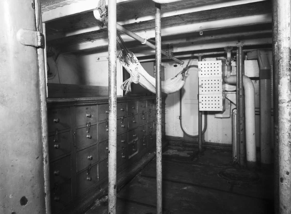 Bilden visar ett rum på pansarskeppet Sverige. På vänster sidan finns ett inbyggt skåp med låsbara lådor och på taket hänger en hängkoj.