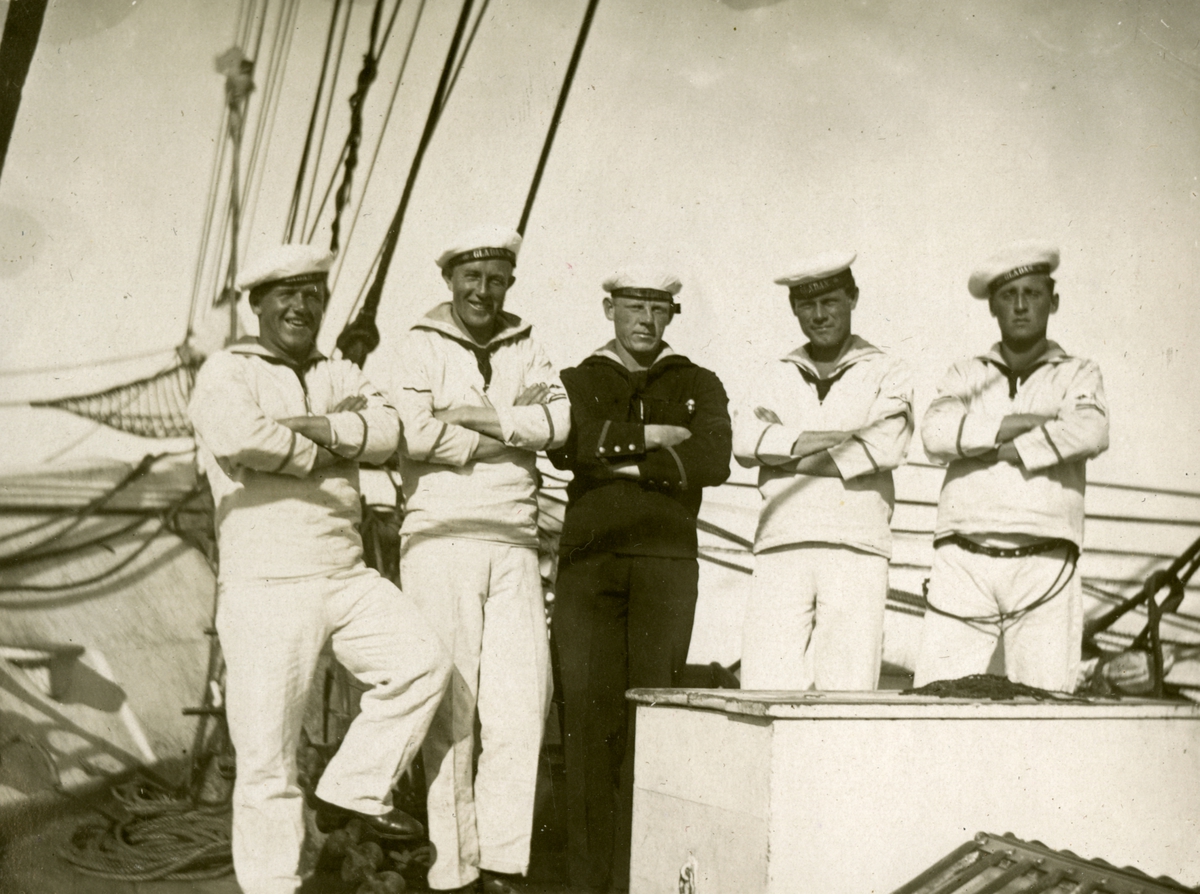 Sjömän ombord ett fartyg. Fyra av personerna har texten GLADAN tryckt på deras mössband. Gustaf Andersson längst ut till höger.