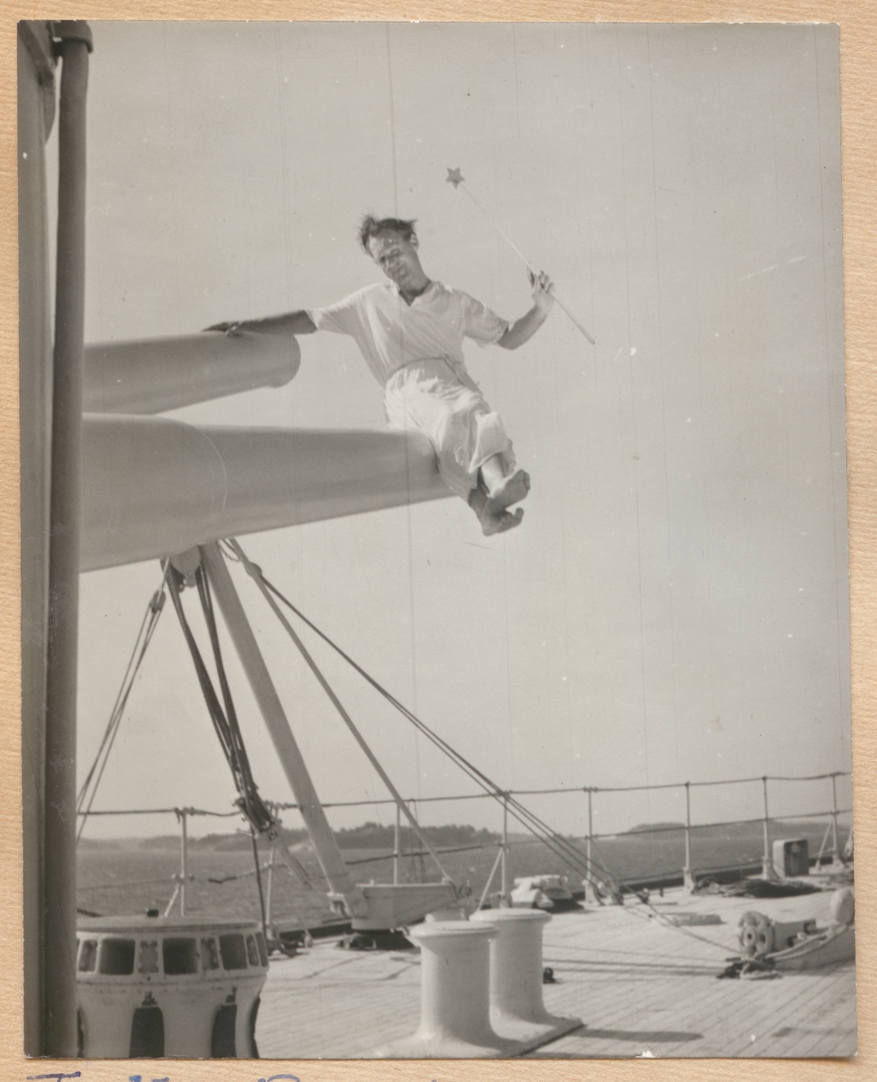 Bilden föreställer värnpliktige Frithiof Billkvist i vit klädsel som sitter på en kanon med en trollstav i handen.