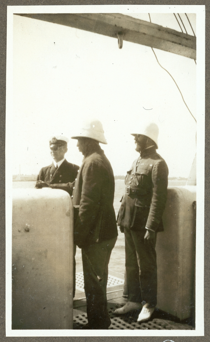 Bilden visar två män i uniformer med tropikhjälm ombord på Fylgia. Enligt titeln är det "sundhetsdokorn".