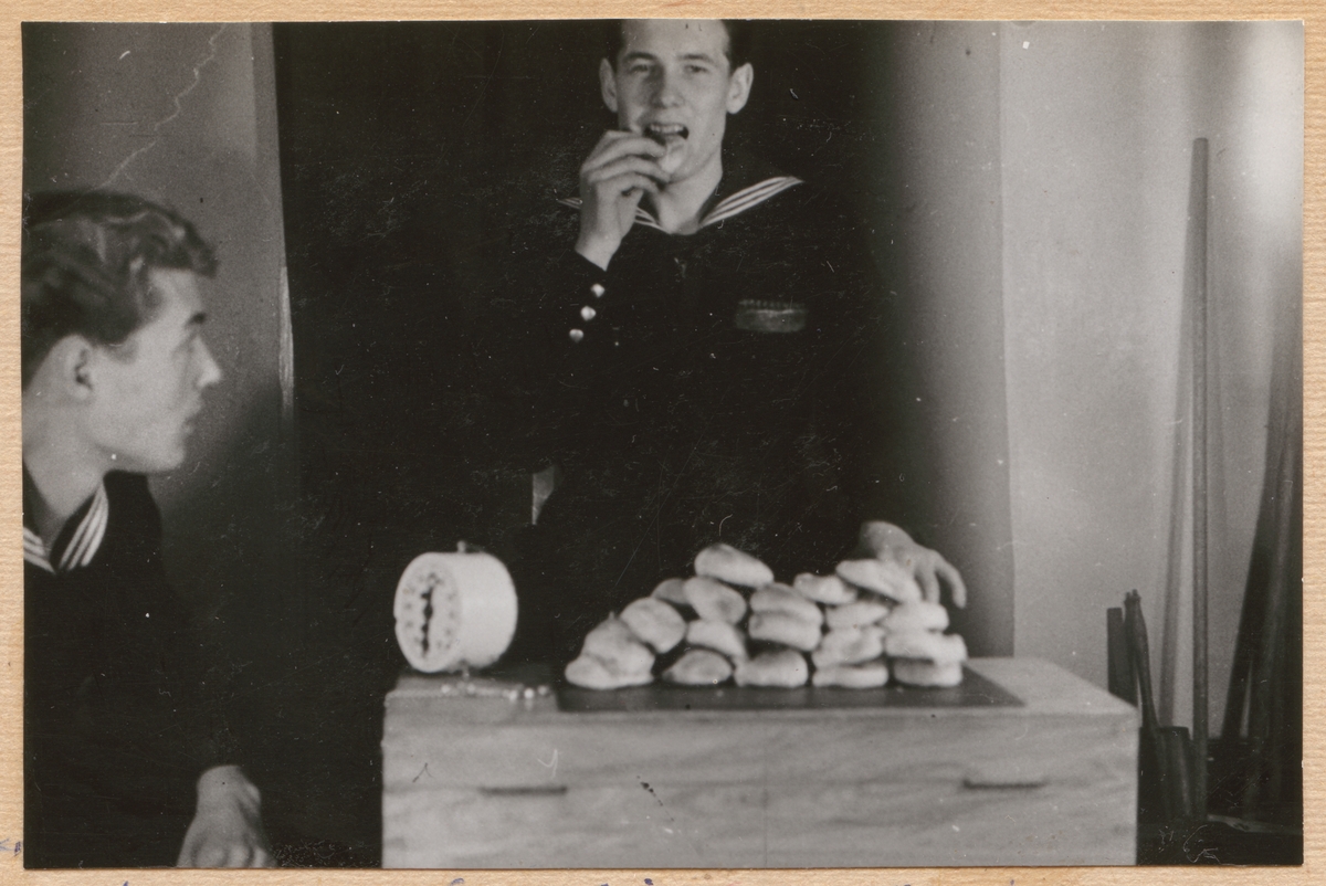 Bilden dokumenterar en ät-tävling bland värnpliktiga på bilddetaljen.