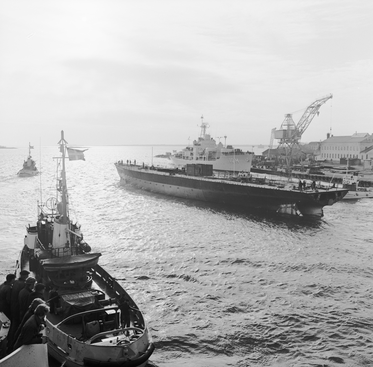 Bilden visar skrovet av minfartyget Älvsborg efter sjösättningen vid Karlskronavarvet.