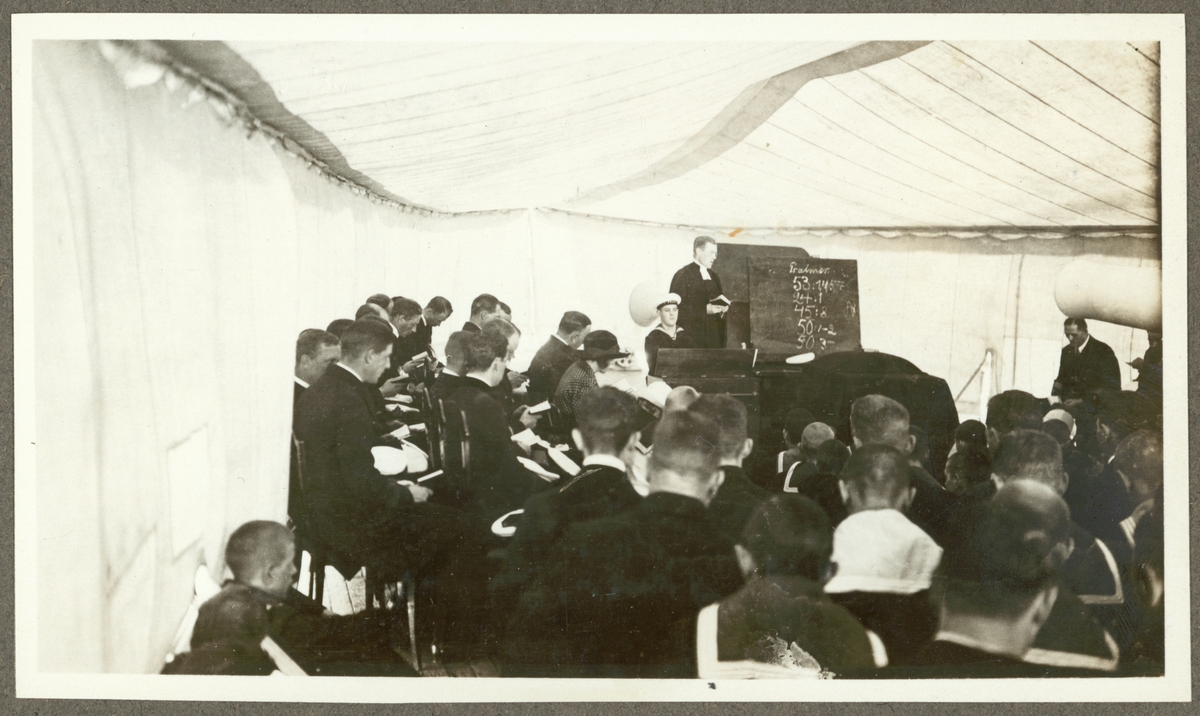 Bilden visar en gudstjänst som hålls ombord på Fylgia. Tjänsten äger rum i ett tält som har slagits upp på förskeppet. I bilden höger kant ser man en av kanonerna