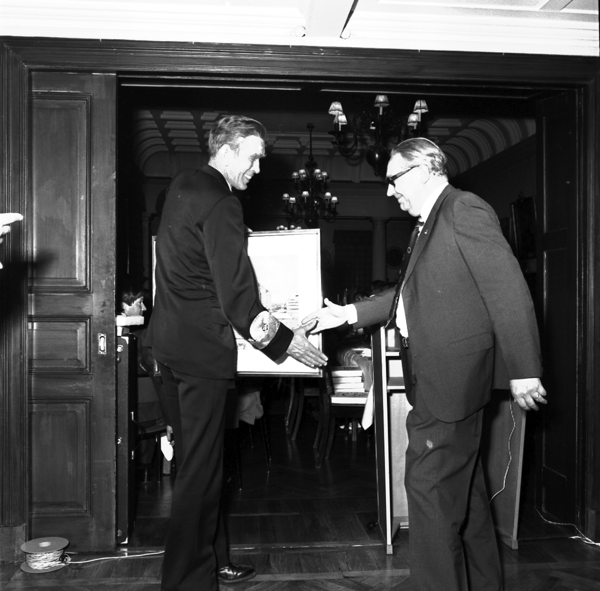 Bilder tagna vid sjösättningsmiddagen i samband med sjösättningen av minfartyget Carlskrona. Viceamiral Rudberg iklädd uniform ifärd med att ta Bert Svanstein i handen. Svanstein är klädd i kostym. Rudberg håller en tavla i ena handen. I bakgrunden skymtar en matsal.