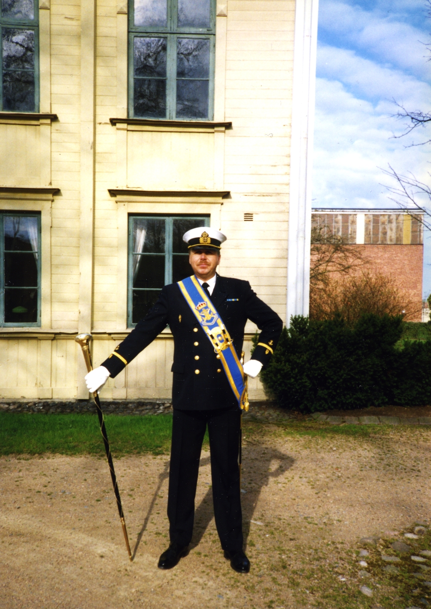 Flaggtrumslagre Anders Karlsson, som leder Flottans musikkår vid årets 1:a maj revelj 1995. Här på fotot utanför f.d. varvschefsbostället uppe vid gröna gången, vid uppvaktingen av chefen för kustflottan