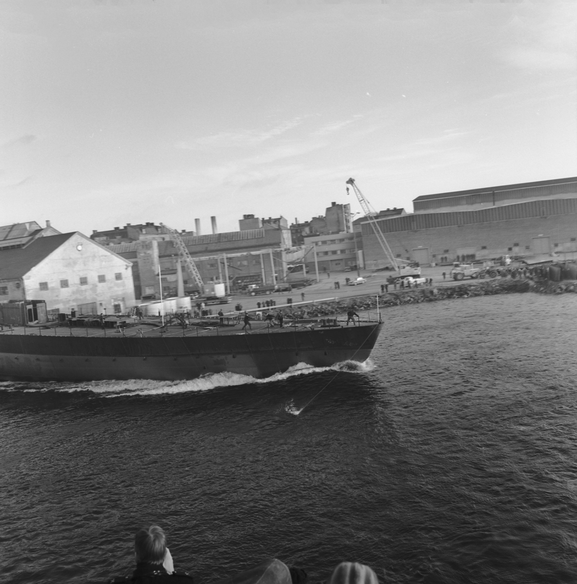 Bilden visar skrovet av minfartyget Älvsborg efter sjösättningen vid Karlskronavarvet.