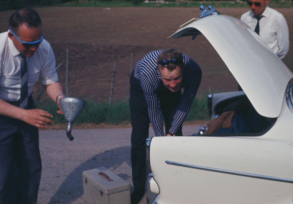 Två män står bakom en bil med öppen bagagelucka. Den ena håller en tratt i handen den andra letar i bagageutrymmet.