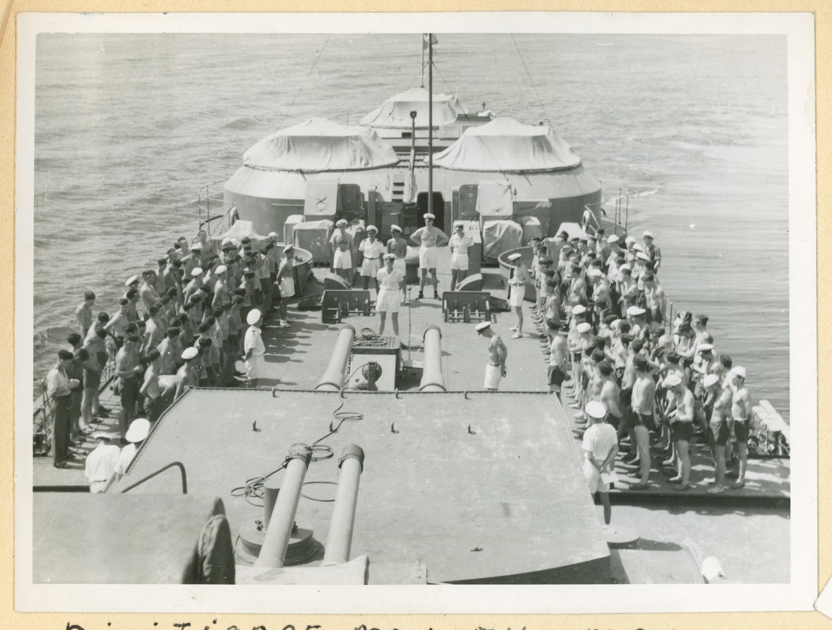 Besättningen har samlats på däck för att inväntar ankomsten av Kung Neptuns sändebud - löparnisse - inför linjedopet ombord på kryssaren Gotland.