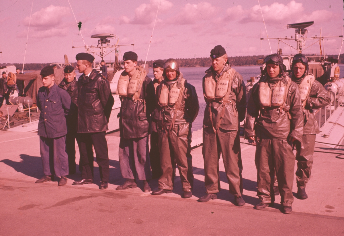 Bilden visar besättningen av T 43 som har tagit uppställning på kajen.