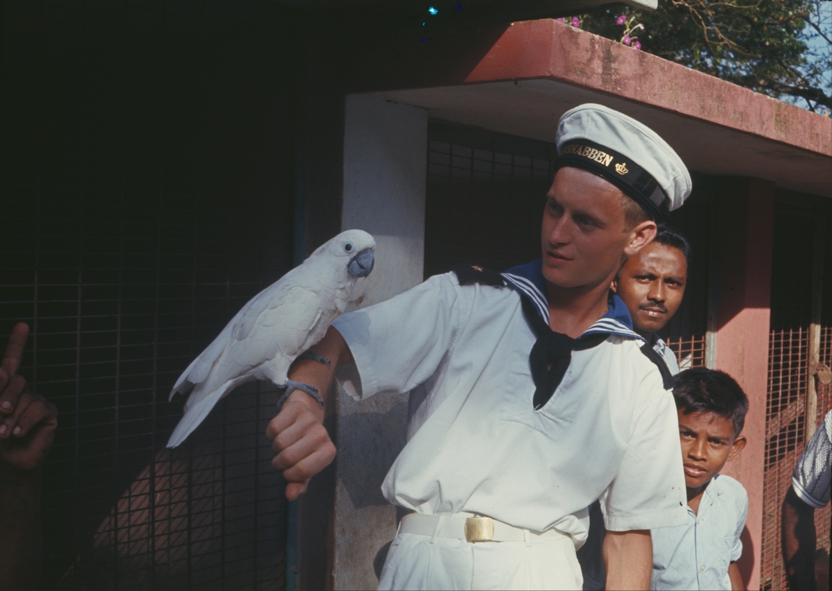 Bilden visar värnpliktiga Bengtsson som håller en papegoja på armen.