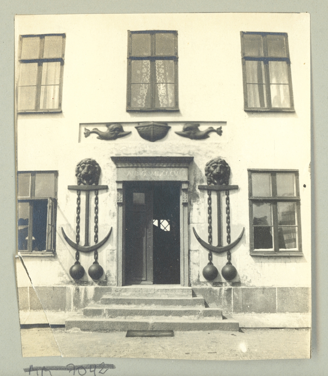 Bilden visar ingången till stabshuset på Nya varvet i Göteborg. Fasaden är utsmyckad med reliefer som visar lejonhuvud, delfiner, ankare med kedjor och en båt.