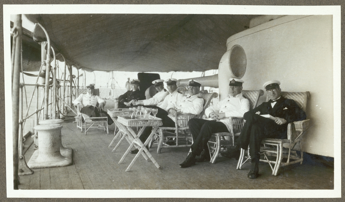 Bilden visar Fylgias sjöofficerare som har samlat sig under solskyddet på akterdäcket för att ta en förmiddagsdrink.