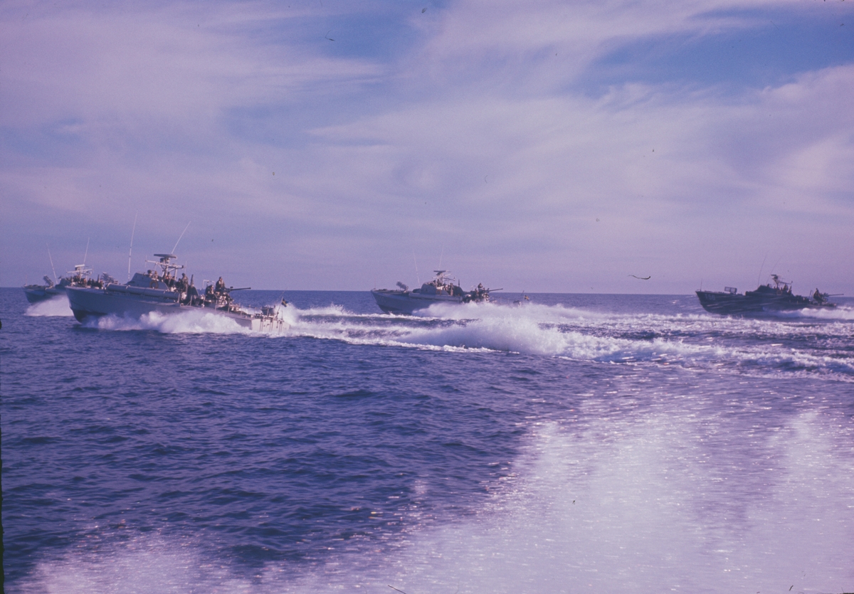 Bilden visar ett flertal motortorpedbåtar till sjöss som kör bredvid varandra i full fart.