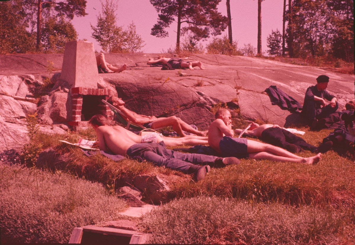 Bilden visar en grupp unga män som solbadar på klipporna.