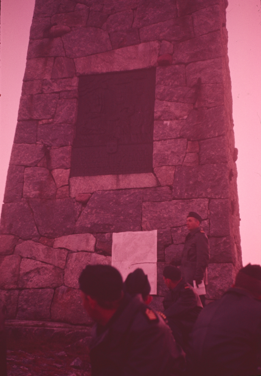 Bilden visar en grupp besättningsmän från motortorpedbåtar framför Älvsnabbenmonumentet på Kapellön.
