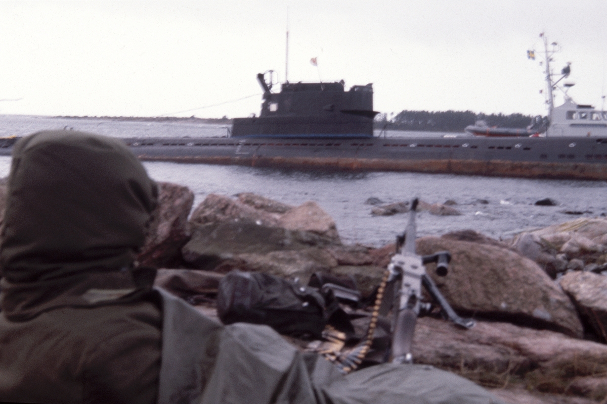 Titel: Bilden föreställer bevakningen av olyckplatsen av svenska kustartillerister och fallskärmsjägare.