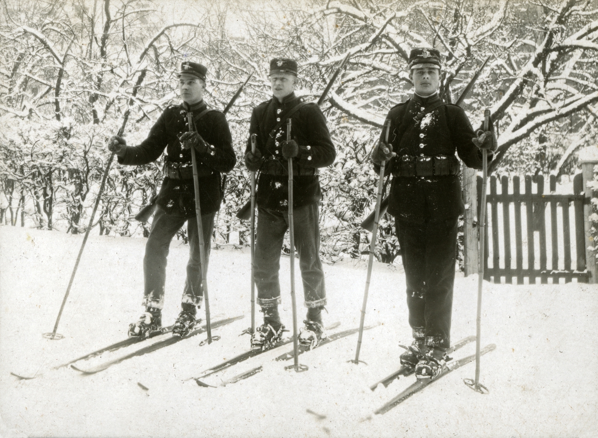 Infanterister poserar och är redo att åka skidor. På mannen längst till vänster finns på mössan siffran 12.