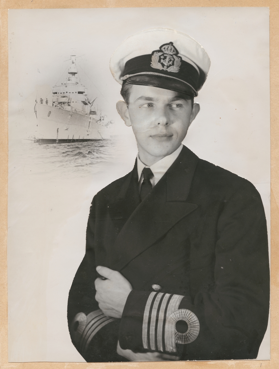 Bilden visar värnpliktige Bengt Berg i kommendörsuniform.
