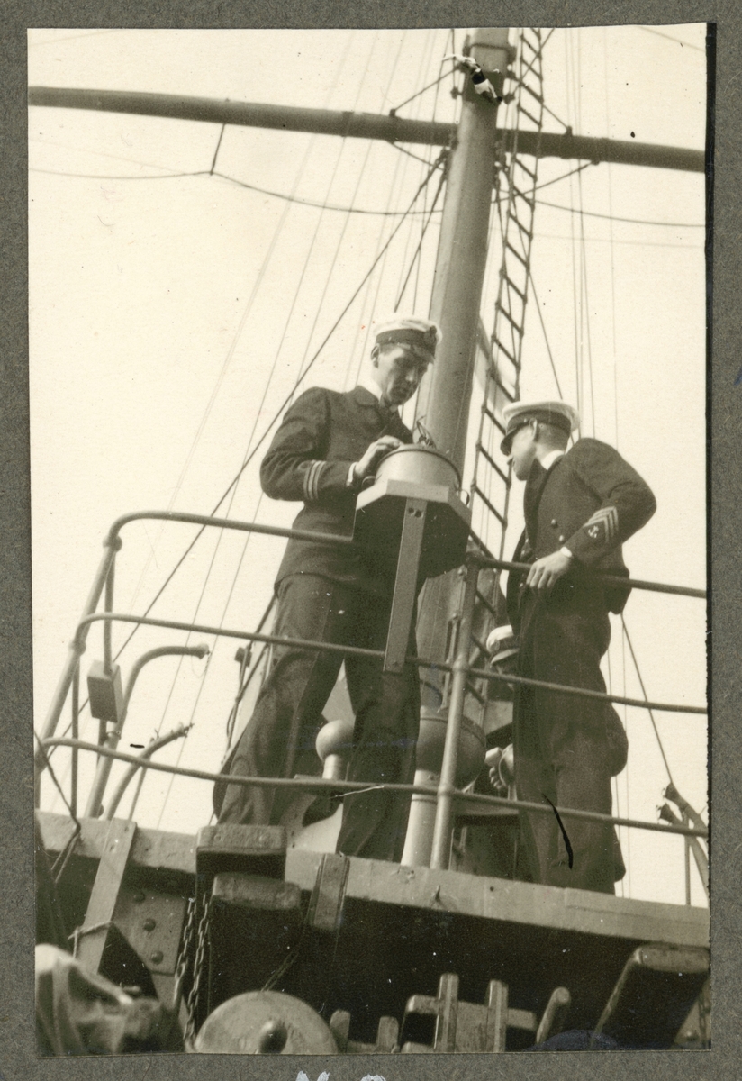 Bilden visar en sjöofficerare på bryggan av en torpedbåt som avläser ett instrument, förmodligen kompassen.