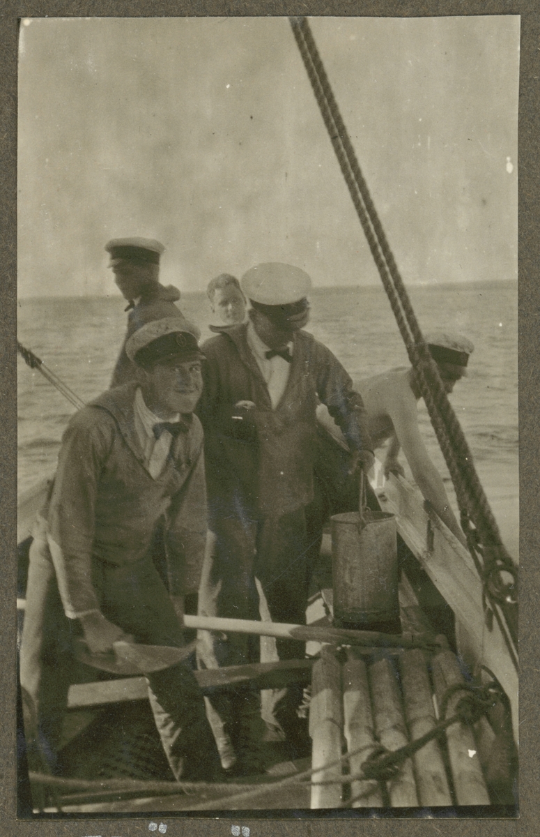 Bilden visar en grupp sjömän i en skeppsbåt.