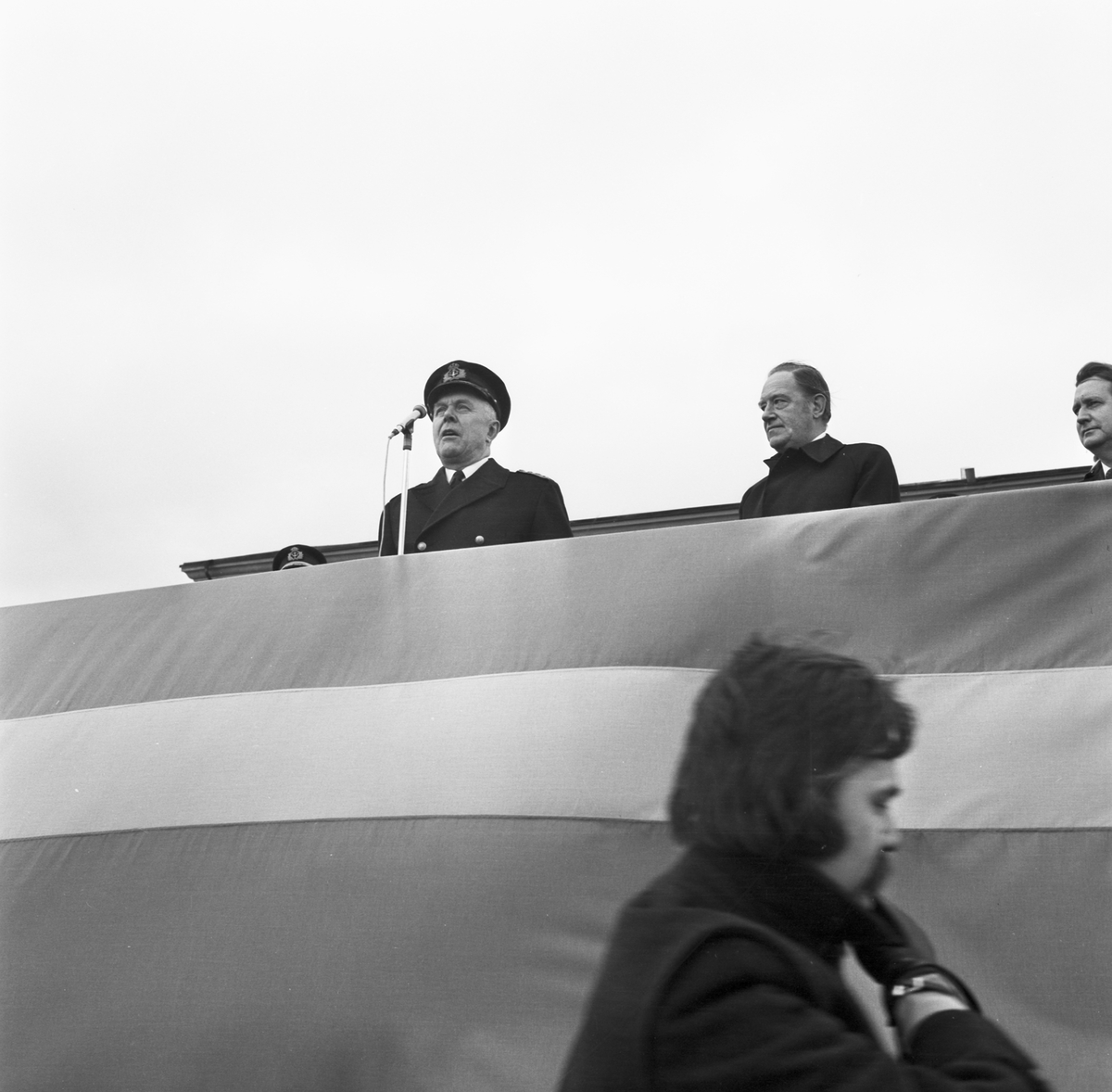 Den före detta marinchefen, amiral Åke Lindemalm håller ett tal under sjösättningen av torpedbåten Varberg.