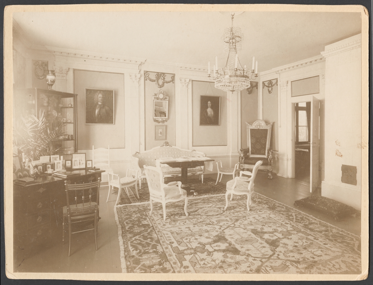 Bilden visar salongen (rum 114) i varvschefsbostället åren 1908-1912. Rummet är inred med klassicistisk interiör. Golvet är täckt med en stor matta och möblerna har arrangerats längs väggarna. Dörren står öppen och leder blicken vidare till salogen (rum 113).