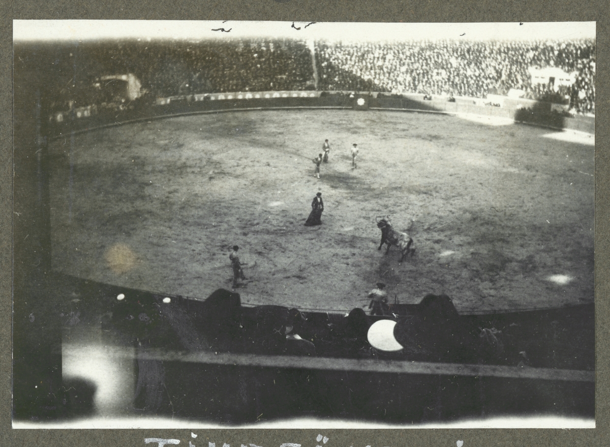 Bilden visar en pågående kamp i tjurfäkningsarenan av La Línea de la Concepción.