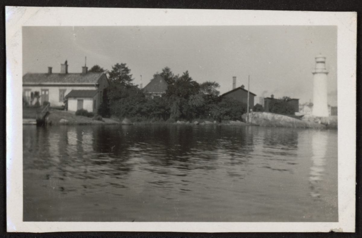Bilden visar Laboratorieholmen sett från havet. Till vänster sidan ligger Kokhuset och till höger fyren.