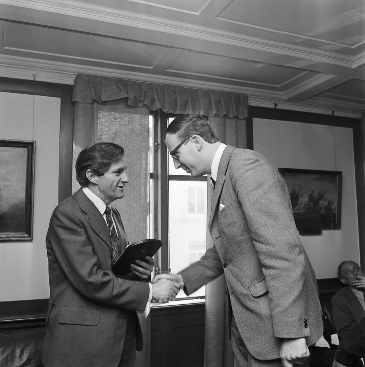 VD:n för Karlskronavarvet Lars-Inge Holster skakar hand med en annan kostymbärare under middagen efter sjösättingen för torpedbåten Strömstad T-141.