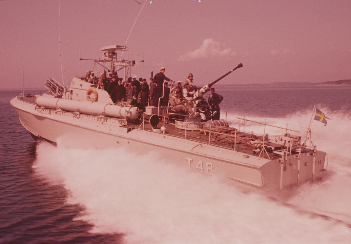 Bilden visar motortorpedbåten T 48 till sjöss i full fart.