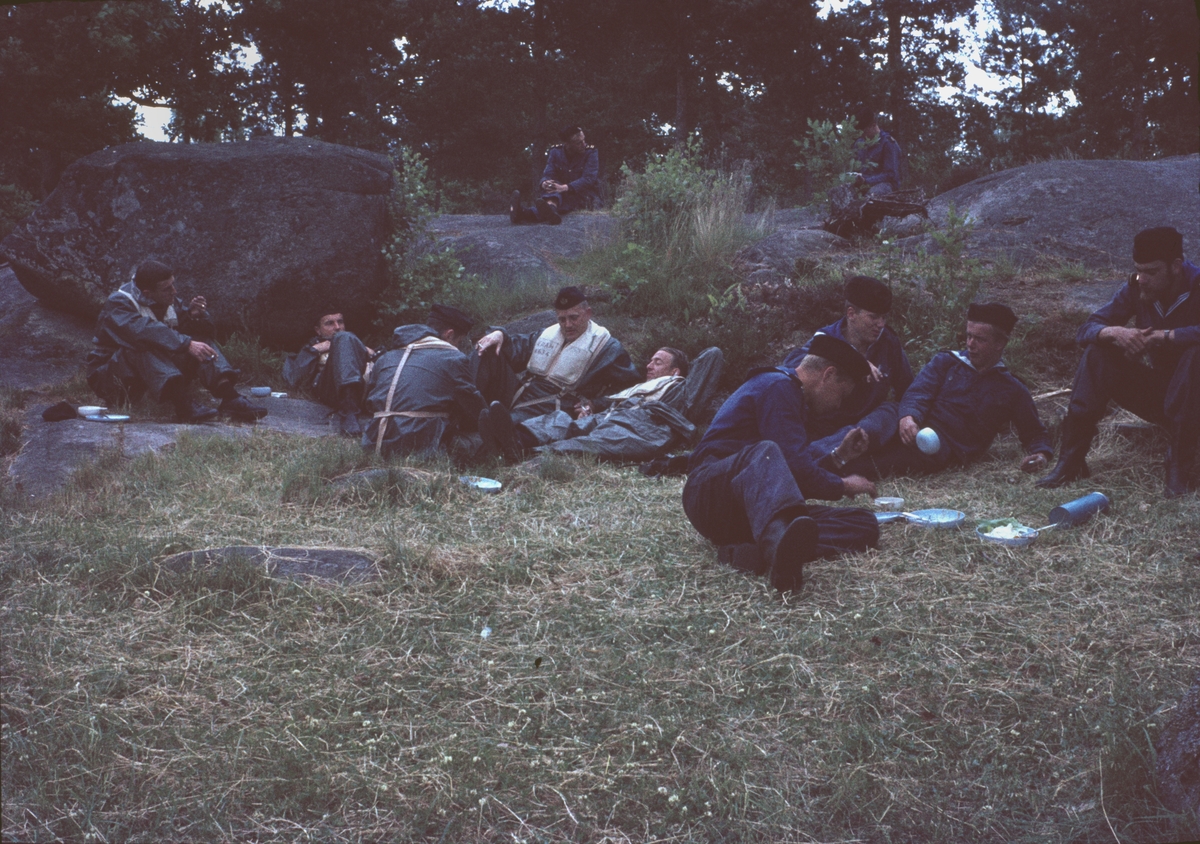 Bilden visar en grupp soldater som ligger på en gräsmatta i en skärgårdsmiljö och äter mat.