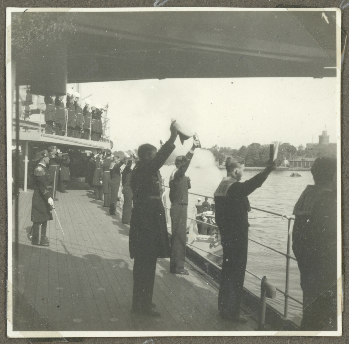 Bilden visar manskapet ombord på Gotland som hälsar kungen Gustav V.
