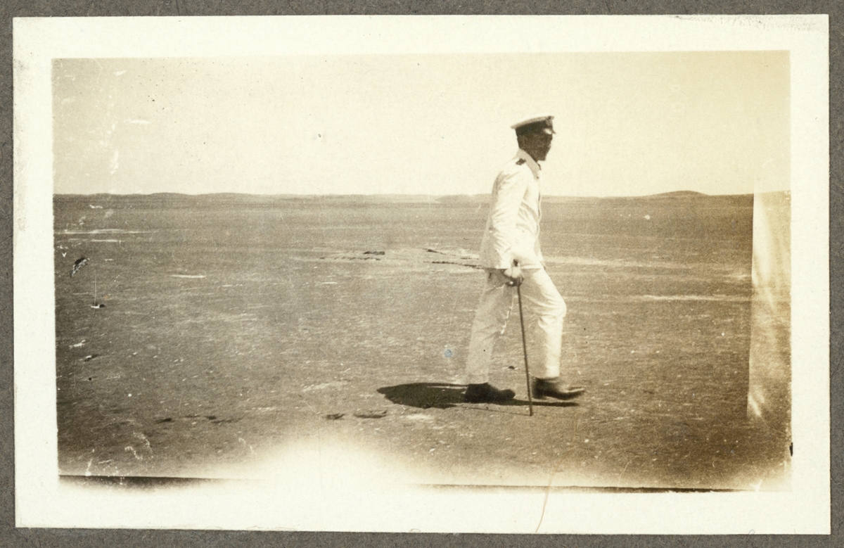 Bilden visar en befäl från Fylgia som promenerar på en strand med en käpp i handen.