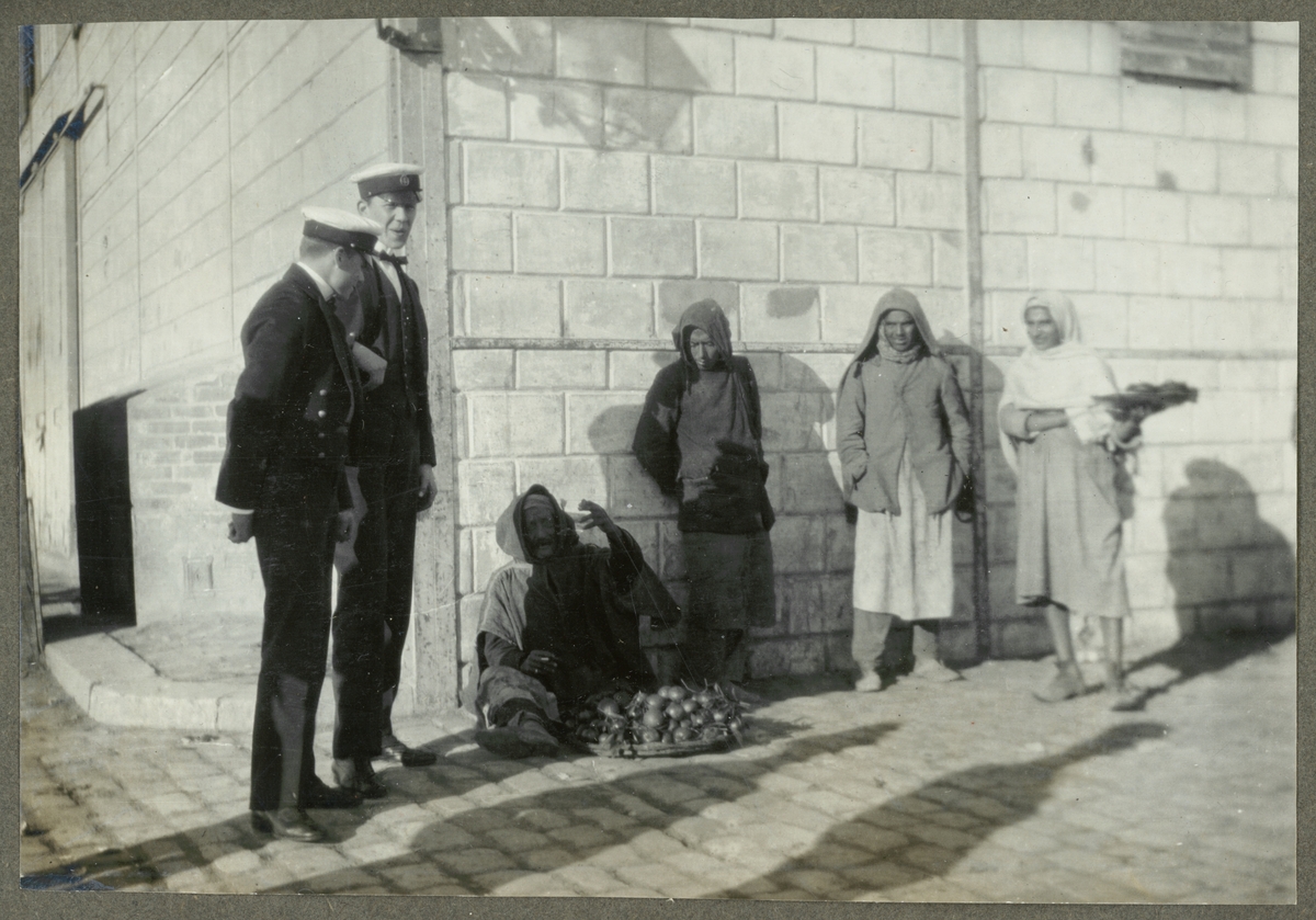 Bilden visar två sjömän från Fylgia som talar med invånare på en gata i Alexandria. Mannen som sitter verka säljer frukt eller grönsaker.