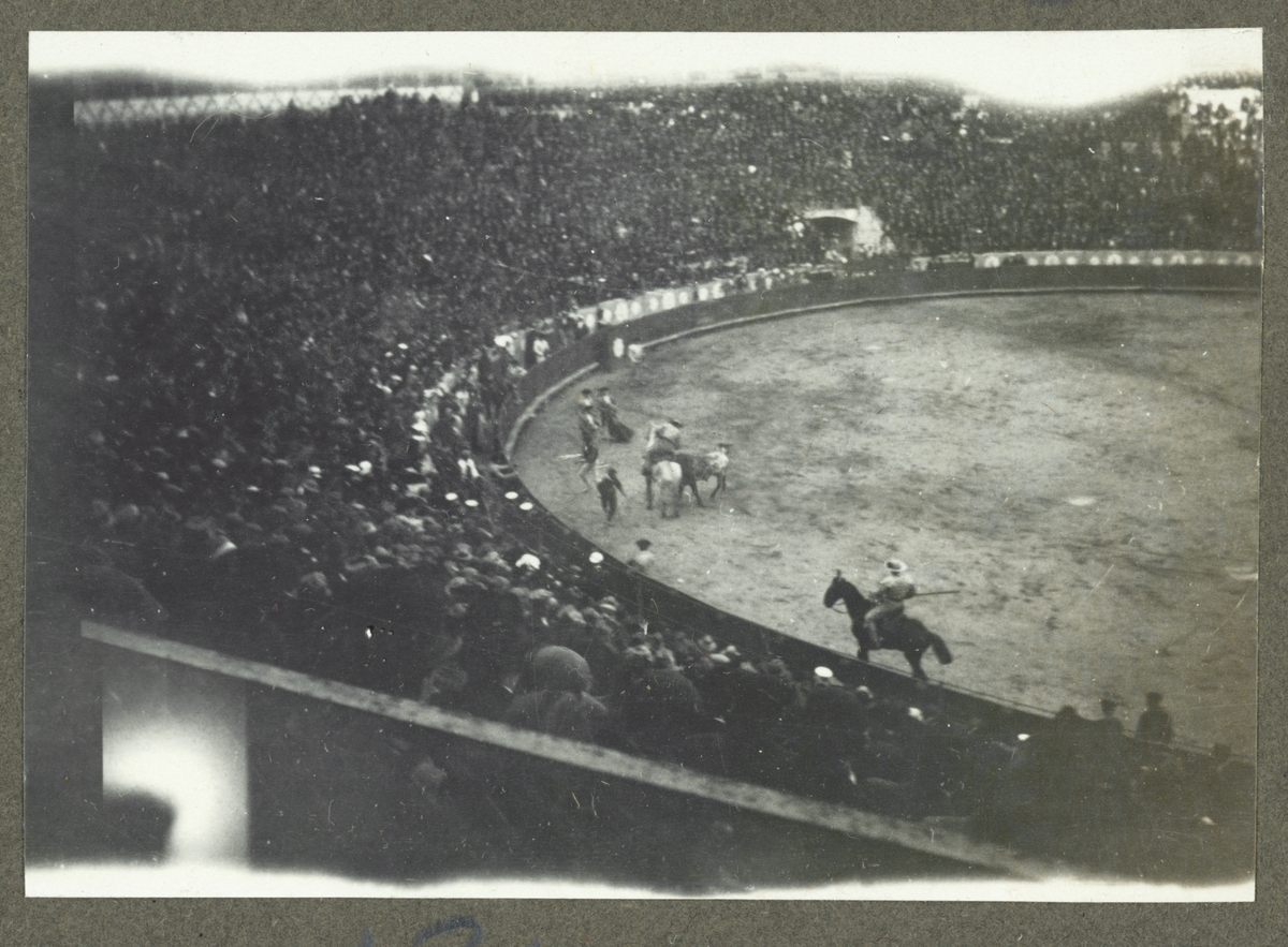 Bilden visar en pågående kamp i en tjurfäktningsarena.