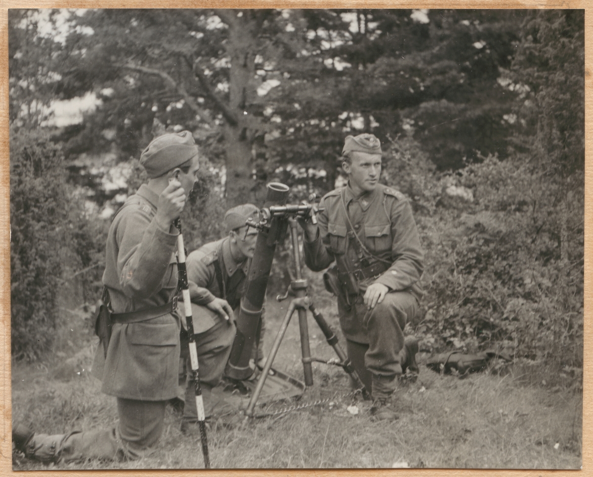 Tre soldater med granatkastare deltar i en militär övning.