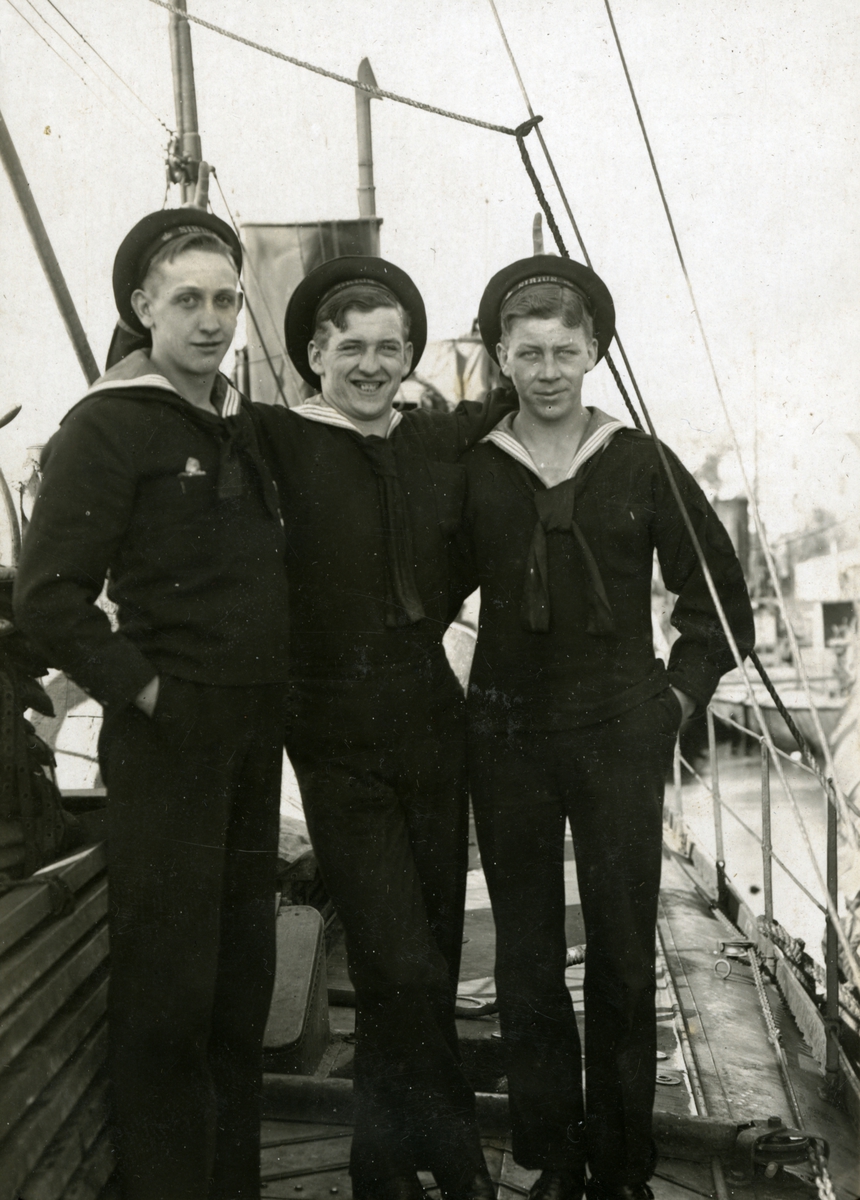 Sjömän poserar ombord ett fartyg, sannolikt en torpedbåt. Gustaf Andersson i mitten. SIRIUS står skrivet på mössbanden.