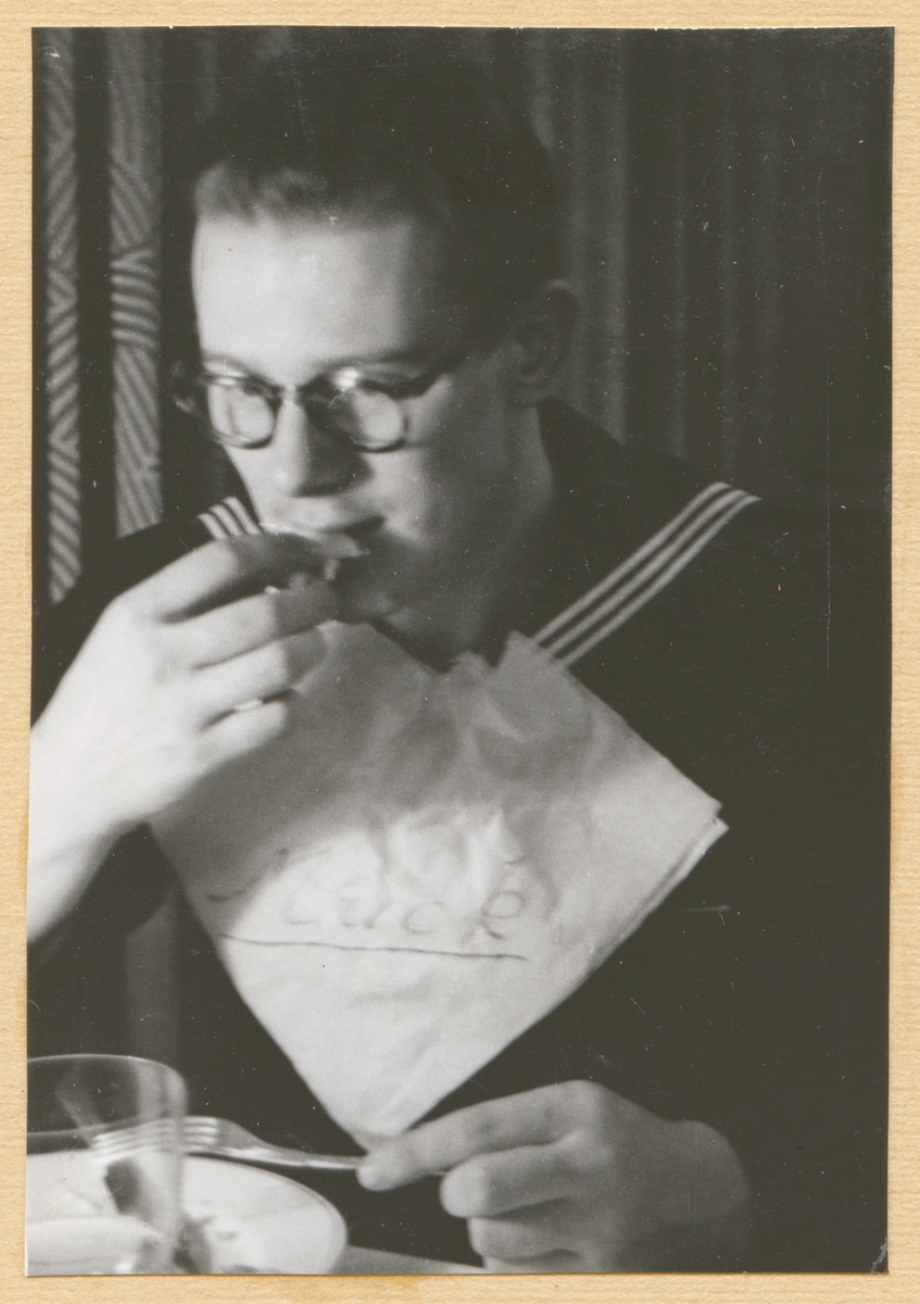 Denna porträtt visar en värnpliktig som firar avslutning av militärtjänsten på restaurangen. Runt halsen har han en servett med påskrift MUCK.