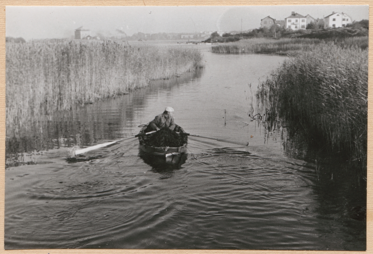 Bilden visar en man som ror en båt som är tung lastad med tång.