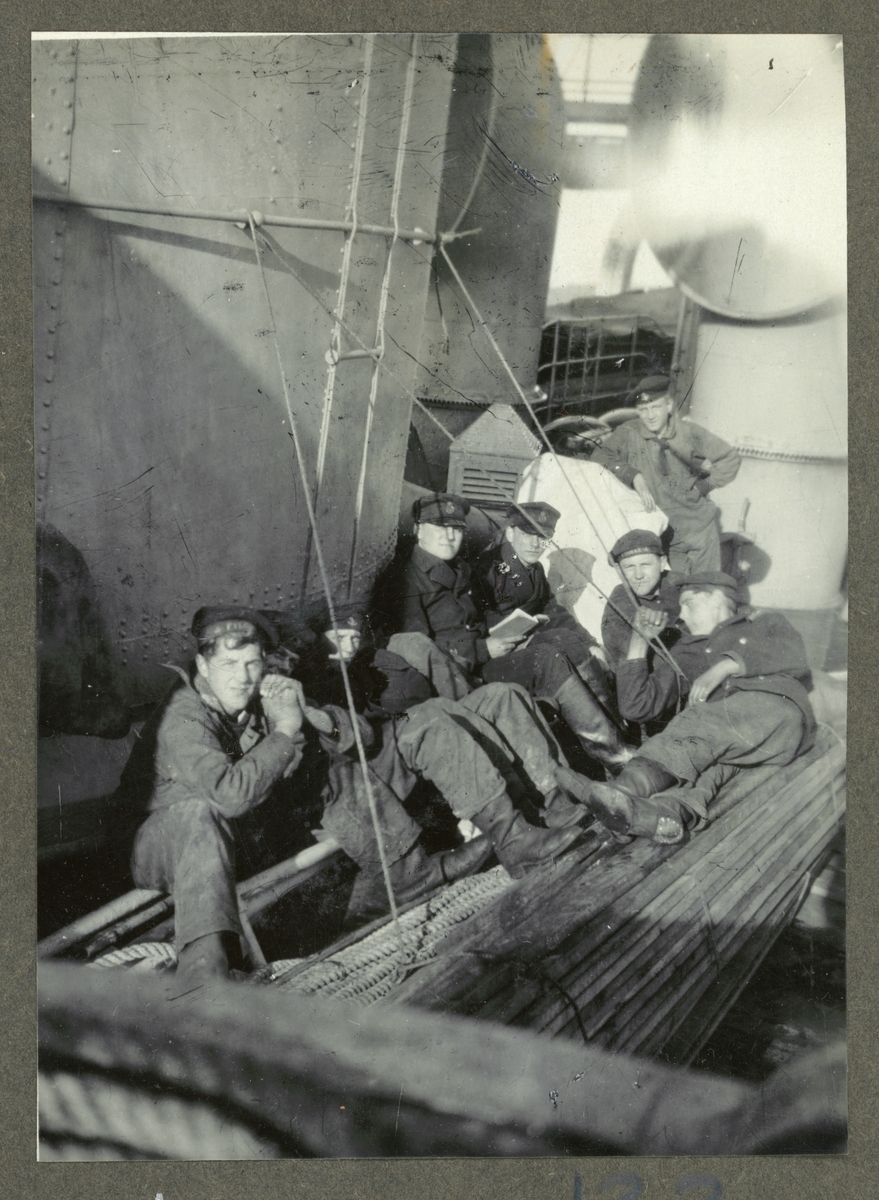 Bilden visar ett gäng skeppsgossar sittande ombord på Fylgia.