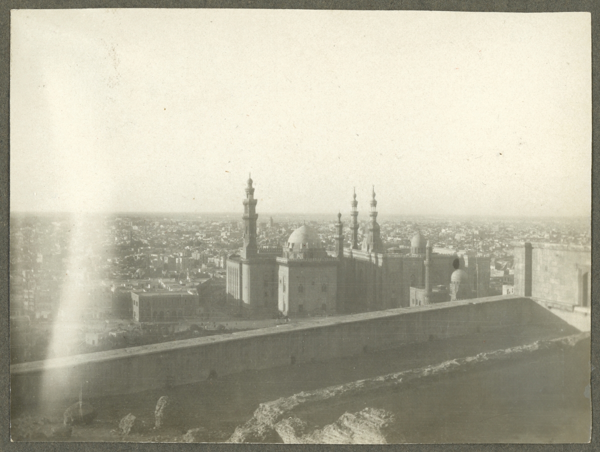 Bilden föreställer en stadsvy över Kairo från citadellen. I bildens centrum syns Sultan-Hasan moskén.